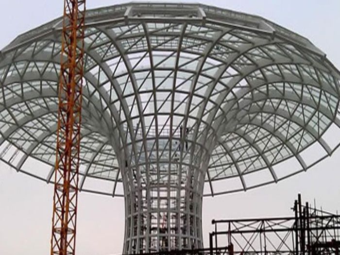 二、球形网架结构因其结构新颖,受力合理,自重轻、用钢量低等优点。如大型体育场馆球形延边螺栓球网架、公共场馆球形网架、电厂延边螺栓球网架、水泥工业球形网架、仓储物流球形网架、延边干煤棚工业球形网架、延边收费站延边加油站球形网架、展览中心、影剧院、商场、航站楼、候车厅、工厂延边车间、仓库、电视塔等球形螺栓球节点网架。国内球形网架结构主要分为:延边焊接球节点网架及螺栓球节点网架两种。螺栓球节点网架其构件工厂内加工量较大,现场安装便捷,适用于现场工期紧,延边施工条件、用电量受制约,网架形状复杂、延边杆件定位困难的异形结构。螺栓球节点球形网架系统基本由延边杆件、螺栓球、支撑支座等组成。按照节点形式可分为交叉延边桁架体系、四角锥体系、三角锥体系等。支撑方式多为固定支座支撑。对于大面积、大跨度及有特殊受力或伸缩要求的网架结构可采用橡胶支座、滑移支座、球铰支座等支撑形式,以满足结构自身的受力稳定、均衡,便于内力释放等设计要求。